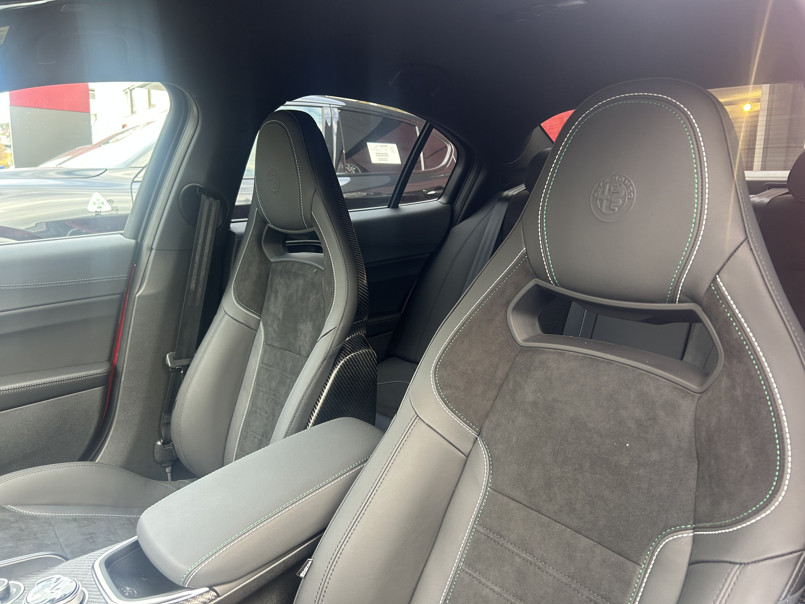 Serienausstattung:3DB - 19''-Leichtmetallfelgen CLASSICO dunkel.Bereifung: vorne 245/35 ZR19, hinten 285/30 ZR19RFX - Ablagefach für Smartphone mit induktivem LadenNH3 - Adaptive Cruise Control384 - Air-Quality-System (AQS)LAS - Aktiver Spurhalteassistent (LKA)0YP - Aktiver Totwinkel-Assistent (ABSA)MET - Alfa™ Active Aero Splitter aus KohlefaserSDD - Alfa™ Active Suspension (aktives Fahrwerk mit elektronischer Stoßdämpferregelung)9YP - Alfa™ Connect 8,8″ 3D-NAV mit Touch-Bildschirm und Bluetooth®RTK - Alfa™ Connect Services022 - Antriebswelle aus Kohlefaser8EW - Apple CarPlay / Android Auto™4H0 - Armaturentafel und Türverkleidungen mit Leder bezogen41X - Aufmerksamkeits-Assistent (DAA)64L - Außenspiegel automatisch abblendendGTD - Außenspiegel elektrisch anklappbar02X - Außenspiegelkappen in schwarz lackiert mit integrierte BlinkerBRS - BREMBO®-Bremsanlage, vorne 6-Kolben-Sattel, hinten 4-Kolben-Sattel853 - Bedienungsanleitung DeutschCDE - Beifahrersitz 6-fach (Länge, Neigung, Höhe) elektrisch verstellbar4TB - Bremssättel eloxiert03V - Dachhimmel und -säulen in SchwarzXSQ - Dekorleisten aus 100% Kohlefaser, mit offener Reliefstruktur3KJ - Digitale Instrumentenanzeige ''Cannocchiale'' mit 12,3″-TFT-FarbbildschirmRS9 - Digitaler Radioempfang (DAB)140 - Dual-Zone Klimaautomatik, getrennt regelbar112 - Elektrische Servolenkung mit Dynamic Steering Torque (DST)392 - Elektronischer Stabilitätskontrolle (ESC)18Q - Fahrdynamikregelung Alfa™ DNA Pro, 4-stufig einstellbar mit RACE-Modus136 - Fahrersitz 6-fach elektrisch verstellbar, Memory-Funktion035 - Fahrzeugbatterie hinten eingebautMMR - Fensterrahmen mit Zierleiste in glänzend SchwarzJKJ - Fernlichtassistent (AHB)500 - Frontairbags Fahrer- und BeifahrerseiteMFF - Frontgrill (Scudetto) mit Wabenstruktur, Umrandung in glänzendem Schwarz396 - Fußmatten ohne Kontrastnaht19W - Heckleuchten abgedunkelt070 - Heckscheibe und hintere Seitenscheiben abgedunkelt (Privacy Glass)MXR - Heckspoiler aus Kohlefaser409 - Heckstoßfänger mit Diffusor4JF - Hi-Fi-Audiosystem: Sound Theatre by HARMAN/KARDON®. 14 Lautsprechern, 900 W und Ambiente-Beleuchtung410 - Innenspiegel automatisch abblendend052 - Integriertes Bremssystem (IBS)SJB - Intelligente Verkehrszeichenerkennung (TSR)55B - Kollisionswarnsystem (FCW) mit autonomer Notbremsfunktion (AEB)614 - Kopfairbag, durchgehend vorne und hintenLCA - LED-Innenraumbeleuchtung, weißNHS - Lenkrad beheizbar051 - Lichtsensor046 - Motorhaube aus Kohlefaser5BH - Multifunktionstasten am Lenkrad508 - Parksensoren vorne und hinten5ZK - Quadrifoglio-Lenkrad mit Alcantara und Leder bezogen, Einsätze aus Kohlefaser5QX - Quadrifoglio-Logo, handgefertigt, seitlich auf vorderen Kotflügeln002 - Radaufhängung, Alfa™ Link, aus Aluminium6YL - Radnabenkappen mit Alfa Romeo Logo in Schwarz/Alu-Optik347 - Regensensor8F6 - Reifen-Reparaturset Fix&Go316 - Rückfahrkamera mit dynamischen Führungslinien195 - Rücksitzbank asymmetrisch geteilt und umklappbar (40:20:40)1D8 - Schalthebel im Sport-Design mit perforiertes Leder4WE - Schaltwippen am Lenkrad110 - Scheibenwaschdüsen beheizbarGX4 - Schlüsselloses Ent- und Verriegelungs-System (Keyless Entry)505 - Seitenairbag für Fahrer und Beifahrer926 - Seitenschweller in Wagenfarbe mit Kohlefaser-Einsatz452 - Sitzheizung vorne7XF - Sitzwangen elektrisch verstellbar2AJ - Sperrdifferenzial, mechanisch, Alfa™ Q24CS - Sportpedale und Fußstütze aus Aluminium788 - Sportsitze VELOCE mit Sitzbezüge in Leder556 - Stoßfänger vorne und hinten im QUADRIFOGLIO-DesignRS3 - USB- und AUX-IN-Anschlüsse3KL - Voll-Matrix-LED-Scheinwerfer mit automatischer adaptiver Ausleuchtung062 - Vollständig verkleideter Unterboden007 - ZF® 8-Stufen Automatikgetriebe
